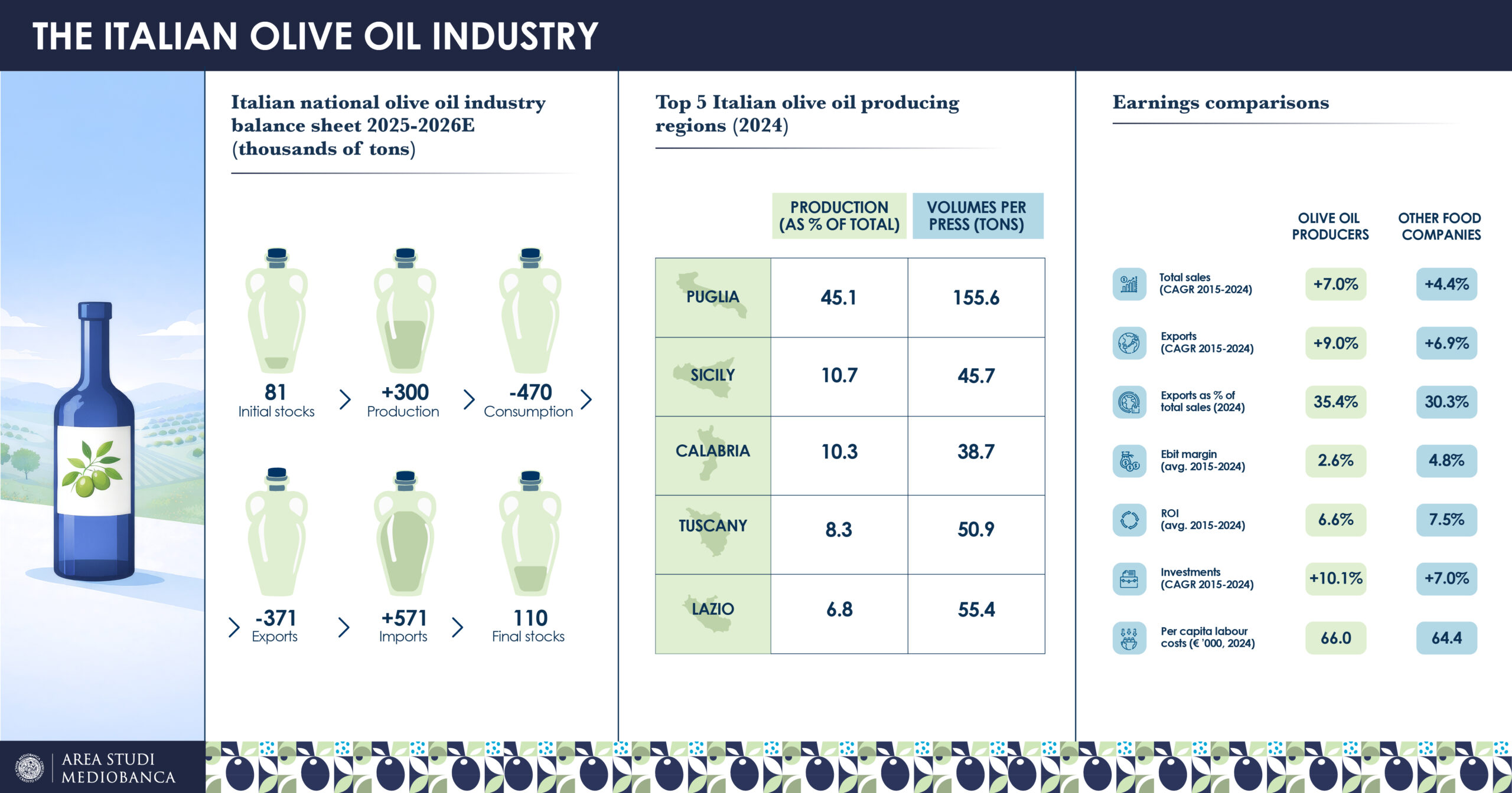 Nel decennio 2015-2024 le vendite dei maggiori produttori italiani di olio d’oliva sono cresciute ad un tasso medio annuo del 7%, più del resto del settore alimentare (CAGR +4,4%) e quasi il doppio della manifattura (+3,9%).